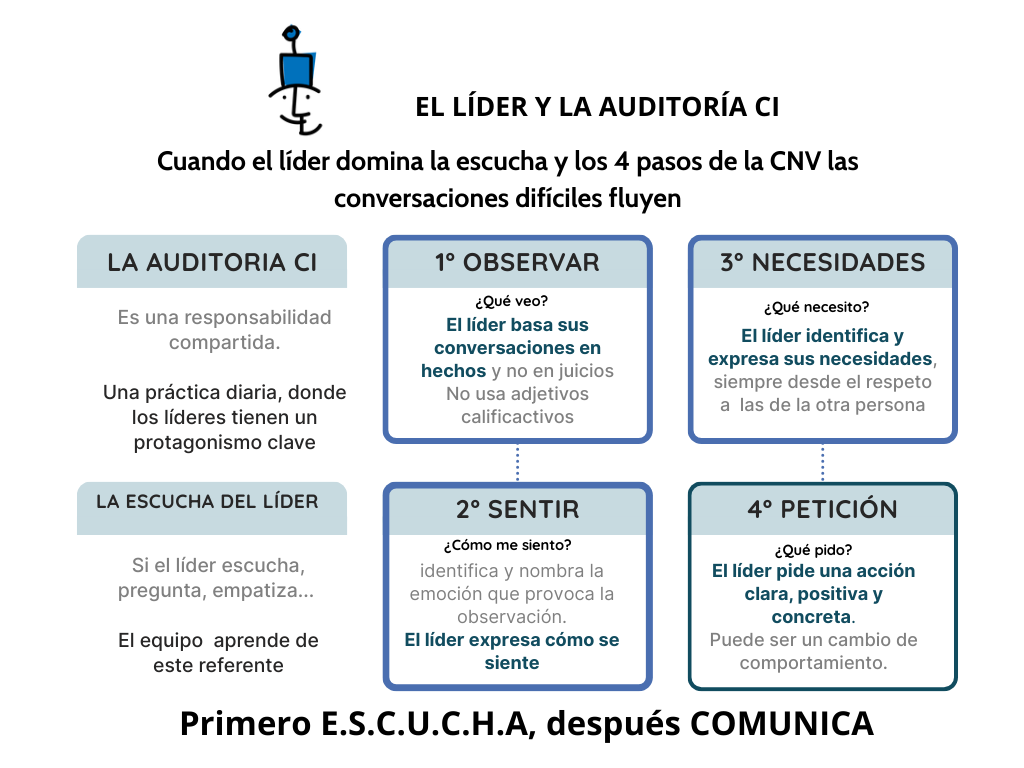 • En consecuencia, cuando el liderazgo audita en tiempo real lo que dice, escucha y valida, el equipo responde con mayor confianza. Por eso, si quieres que tu equipo te escuche, aplica la escucha reflexiva y los cuatro pasos de la Comunicación No Violenta.